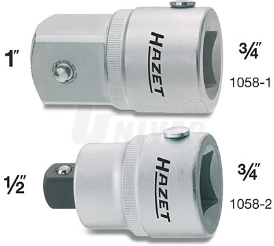 Adaptéry HAZET 1058-1 (z 3/4" na vývod 1") a 1058-2 (z 3/4" na vývod 1/2") jsou vyrobeny z vysoce kvalitního chrom-vanadia s pochromovaným povrchem. Splňují požadavky DIN 3123 a ISO 3316.
