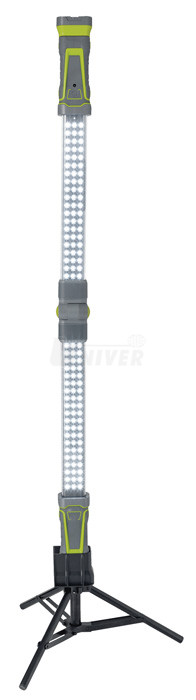Velmi praktická montážní lampa má 120 LED SMD, nabíjecí Li-ion baterii 3,7 V 4000 mAh, nabíječku, skládací, natáčecí konstrukci, na každém konci hák pro zavěšení a dva silné magnety a stojan.- praktická, víceúčelová montážní lampa