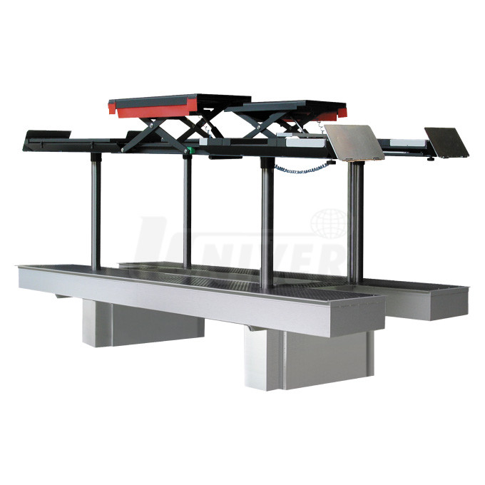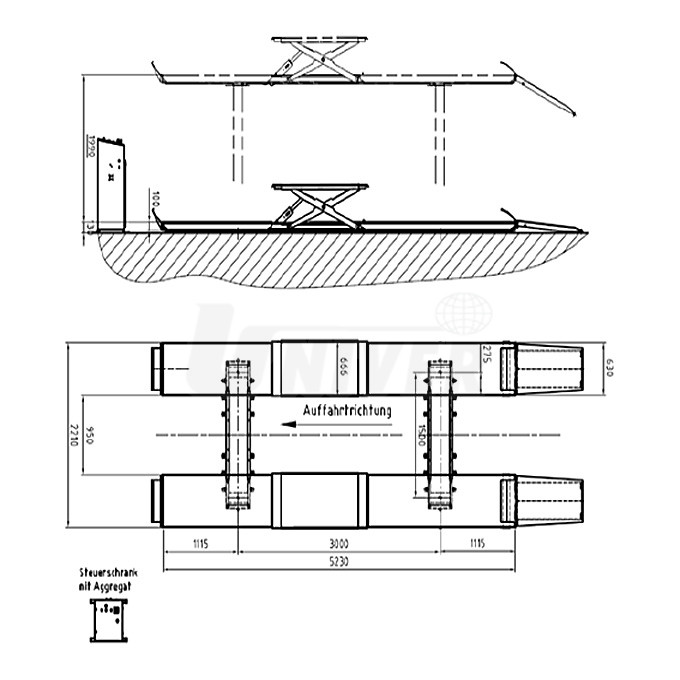 Čtyřpístový hydraulický podpodlažní zvedák s nosností 5,5 t, se 2 plošinami dl. 5 230 mm, šířky 630 mm, vzdáleností mezi plošinami 950 mm a oboustranným přídavným nůžkovým zvedákem 3,5 t.