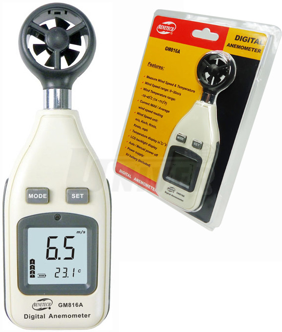 Digitální anemometr / měřič rychlosti proudění vzduchu a teploměr slouží zejména pro měření výkonu ventilátorů (např. klimatizace atd.), při plachtění, létání větroněm / balonem, jachtingu, surfování atd.- zobrazení současné, maximální a průměrné rychlosti proudění vzduchu