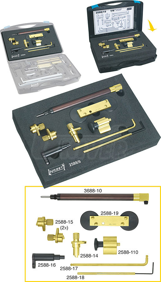 9-dílná doplňková sada přípravků v plastovém kufříku pro nastavování/časování rozvodů benzinových i naftových motorů vozů Volkswagen/Audi/Škoda/SEAT se využívá také při výměnách rozvodových řemenů i dalších opravárenských úkonech. Jedná se o účelný doplněk základní sady HAZET 2588/19. Doplňkovou sadu lze umístit i do kufříku sady HAZET 2588/19 Používá se pro následující motory:benzínové motory: