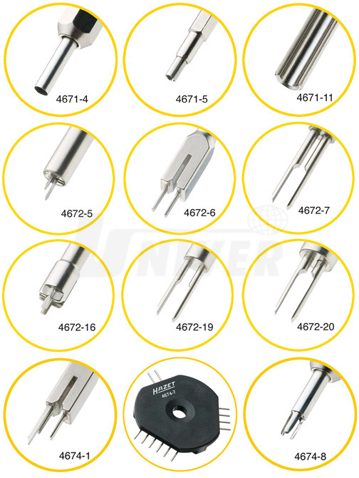 Doplňková sada pro rozpojování/vypichování vidlicových, plochých i okrouhlých konektorů (11-dílná) účelně doplňuje základní sadu HAZET 4670-1/12 o vypichováky pro vozy Daimler/Mercedes-Benz/Chrysler. Umožňuje tzv. vypíchnutí/vnitřní rozpojení konektorů bez nebezpečí jejich poškození, tudíž i rychlé a profesionální odstranění závad kvůli vadnému kontaktu v konektoru apod. umístěná v plastovém kufříku obsahuje tyto komponenty:4671-4 5 11