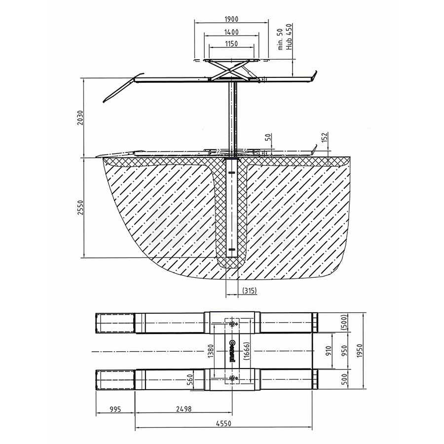 Dvoupístový hydraulický podpodlažní zvedák s nosností 3,5 t, se 2 plošinami dl. 4550 mm, šířky 500 mm, vzdáleností mezi plošinami 950 mm a oboustranným přídavným nůžkovým zvedákem.- vodicí i opěrný píst tvrdě pochromované