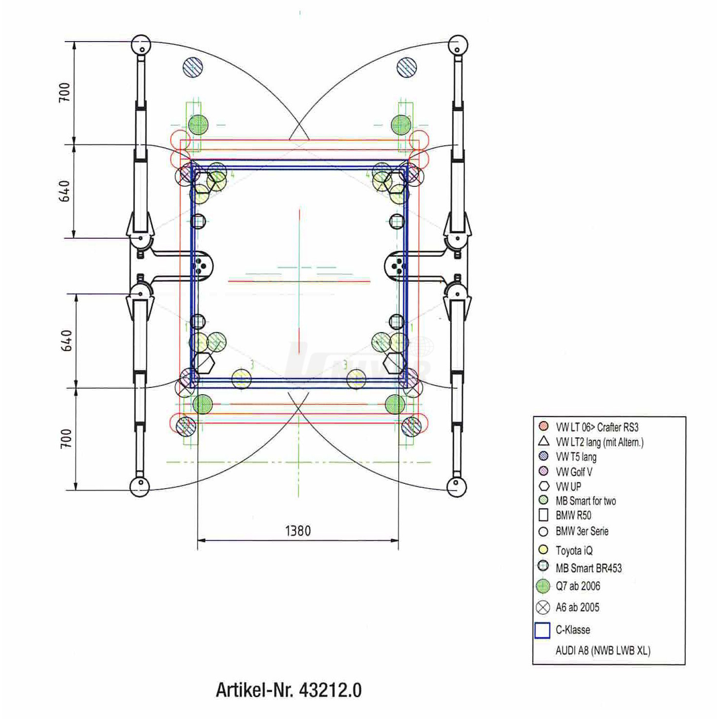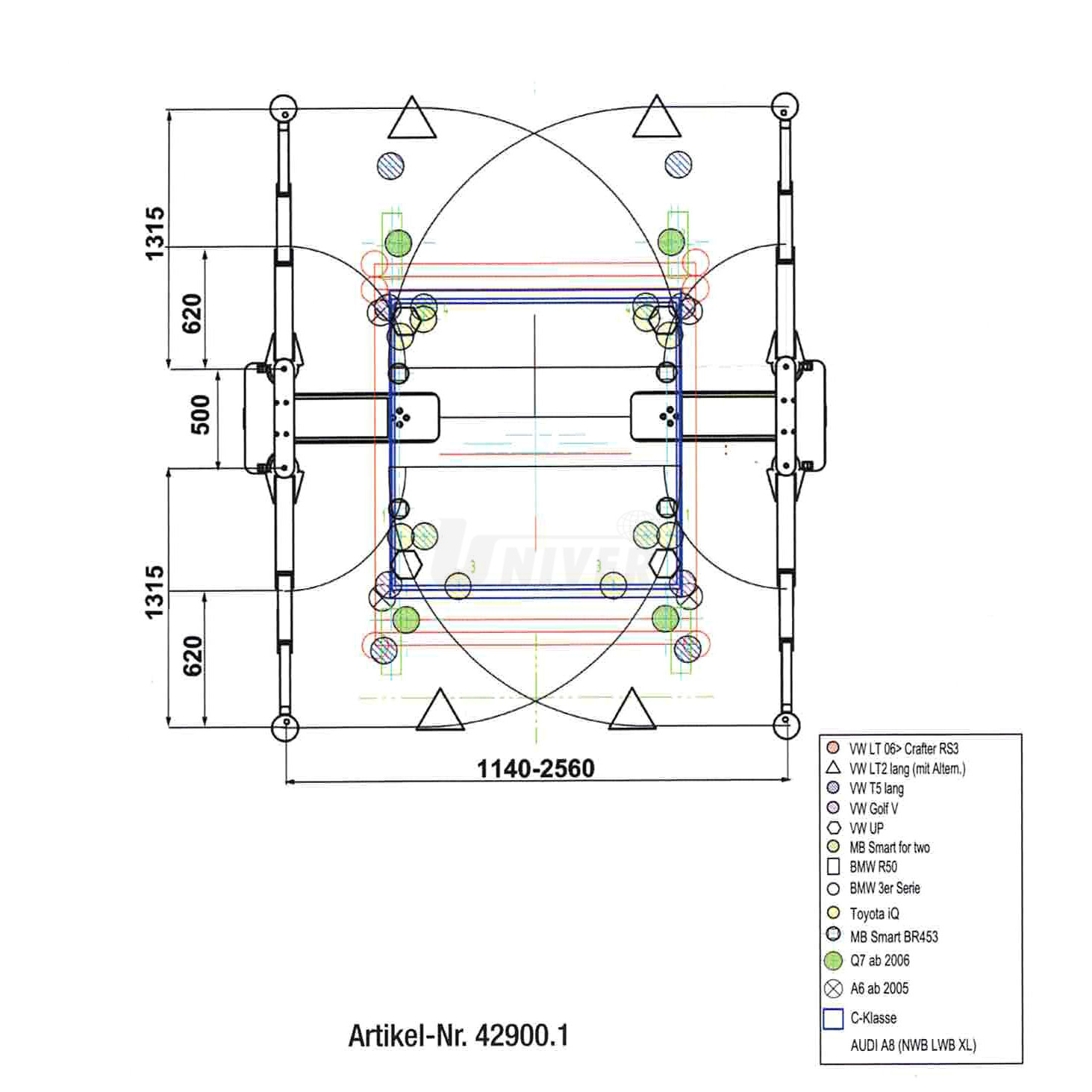 429001 – nastavitelná vrchní nosná konstrukce v rozsahu 1140 – 2560 mm, nosná část s výkyvnými 3-dílnými rameny, 2-násobně teleskopickými, aretace nosných ramen, nosné talíře z tvrdé gumy a profilem, lze je vyšroubovat o cca 30 mm