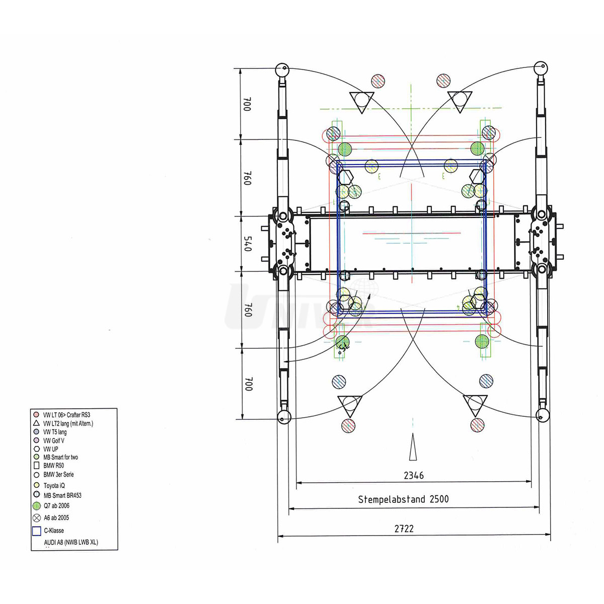Dvoupístový hydraulický podpodlažní zvedák s nosností 4,0 t, se vzdáleností pístních jednotek 2500 mm, s 3-dílnými otočnými a délkově nastavitelnými nosnými rameny.- nosná část s výkyvnými 3-dílnými rameny, 2-násobně teleskopickými, aretace nosných ramen, nosné talíře z tvrdé gumy a profilem (58586.9)