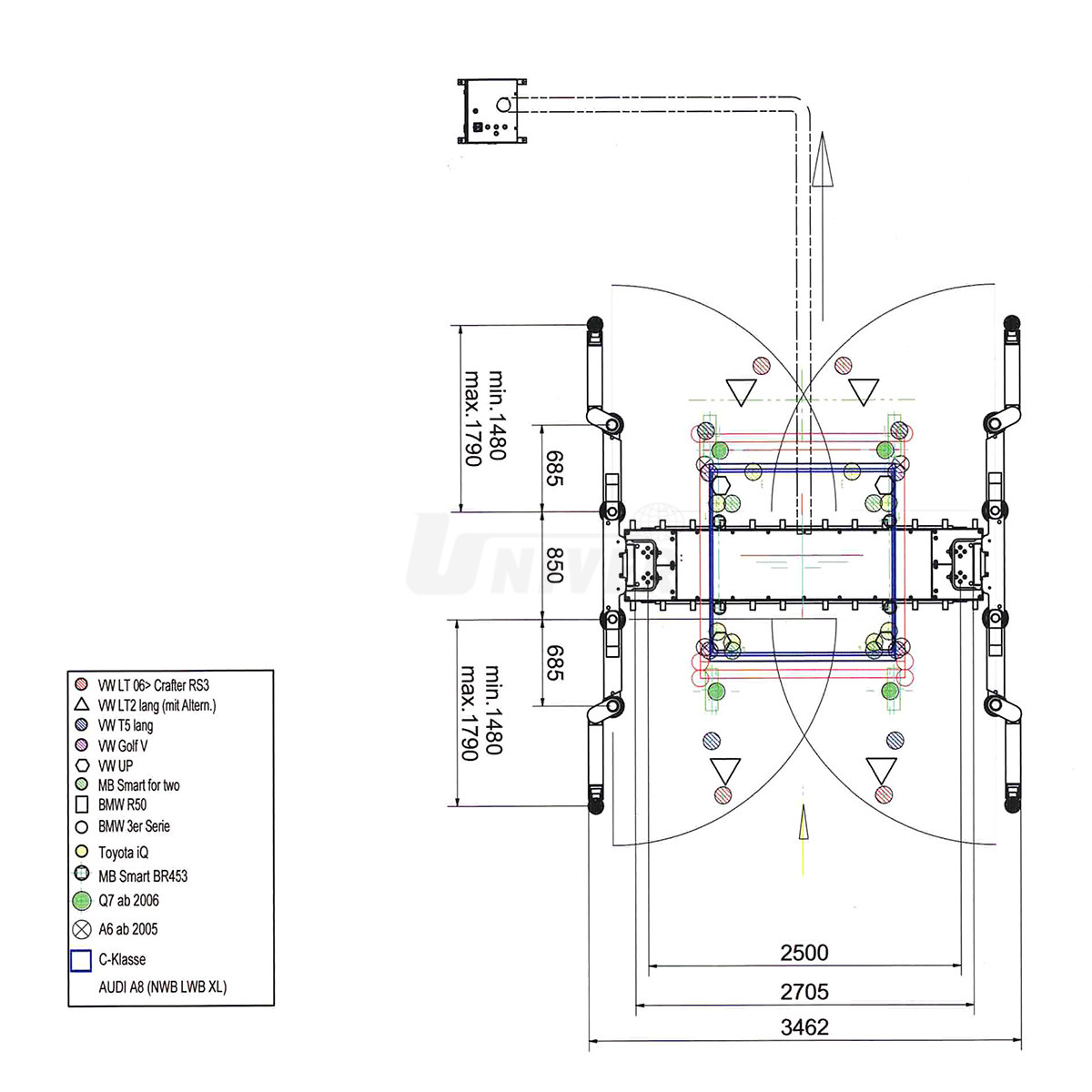 Dvoupístový hydraulický podpodlažní zvedák s nosností 5,5 t, se vzdáleností pístních jednotek 2500 mm, s volitelnou horní nosnou částí se 4-dílnými otočnými a délkově nastavitelnými nosnými rameny.- vodicí i opěrný píst tvrdě pochromované