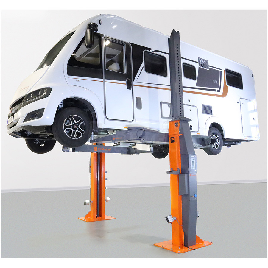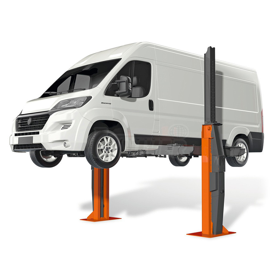 Dvousloupový elektrohydraulický zvedák se symetrickými nosnými rameny s nosností 7500 kg v robustním tzv. bezprahovém provedení.- dvousloupový elektrohydraulický bezprahový zvedák se symetrickými rameny s nosností 7500 kg pro zvedání osobních a menších užitkových automobilů