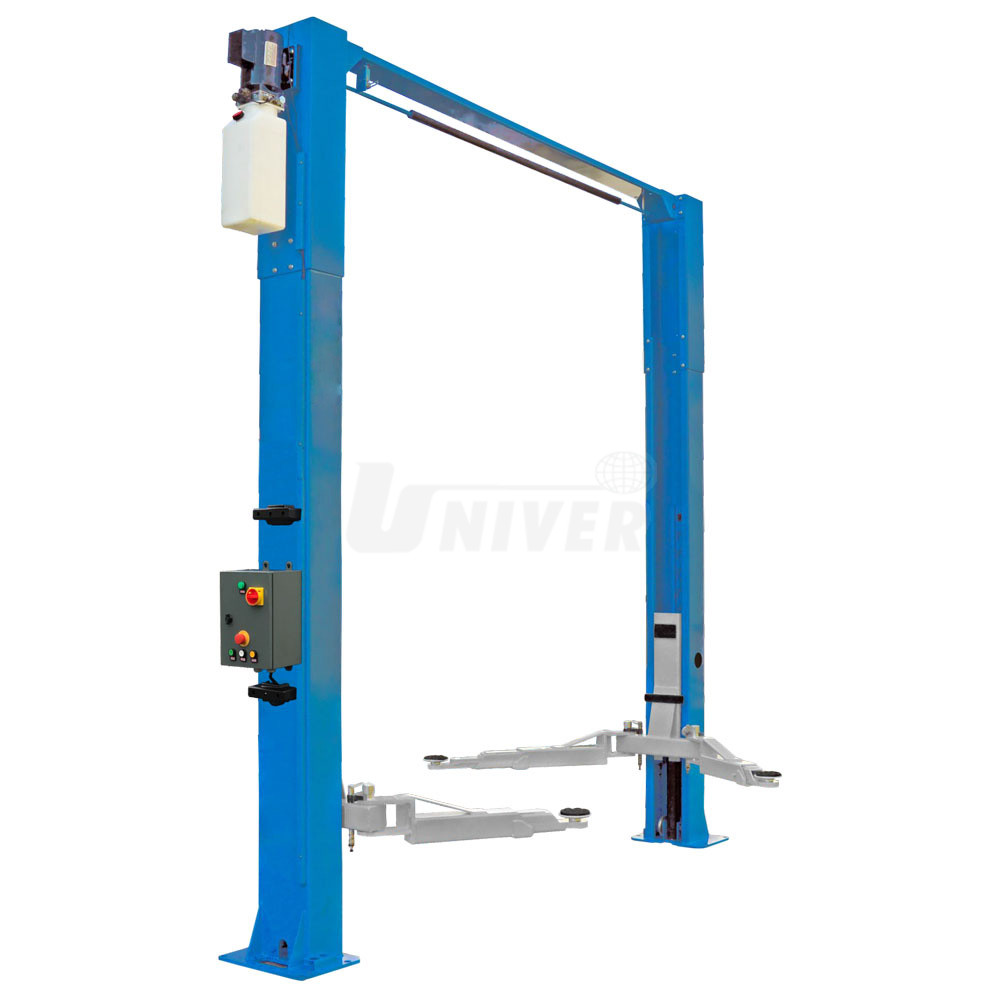 Elektrohydraulický dvousloupový asymetrický zvedák bez spojovacího prahu / přejezdu mezi sloupy s nosností 4000 kg a s elektromagnetickým odjištěním západek.