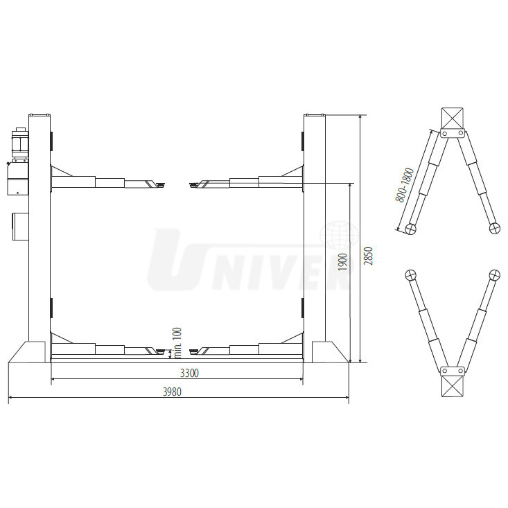 symetrická, výsuvná nosná ramena s automatickou aretací polohy jejich natočení, snadno tak lze dosáhnout zvedací body u menších i velkých automobilů, konce nosných ramen jsou opatřené výškově nastavitelnými patkami pomocí adaptérů (180 mm ve standardní dodávce)