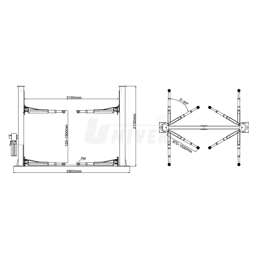 asymetrická, variabilně nastavitelná nosná ramena (výsuvná a kloubově natáčecí) s automatickou aretací polohy jejich natočení, snadno tak lze dosáhnout zvedací body u menších i velkých automobilů (např. SUV apod.)