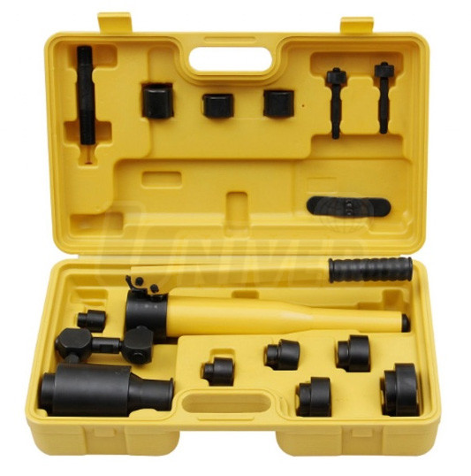 Hydraulická prostřihovačka umožňuje děrovat zejména ocelové plechy v rozsahu Ø 22 – 60 mm a to až do tloušťky 1,6 mm (nerezová ocel) a 3,2 mm (měkčí ocel).- robustní a odolné ruční pákové hydraulické děrovací kleště jsou koncipované jako 15-dílná sada (základní hydraulické pákové kleště a děrovací nástroje)