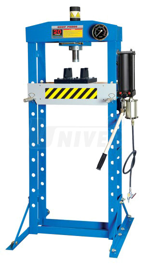 Stojanový hydraulický lis (20 t) s ručním ovládáním pneumaticko-hydraulické jednotky.- robustní automatem svařená konstrukce