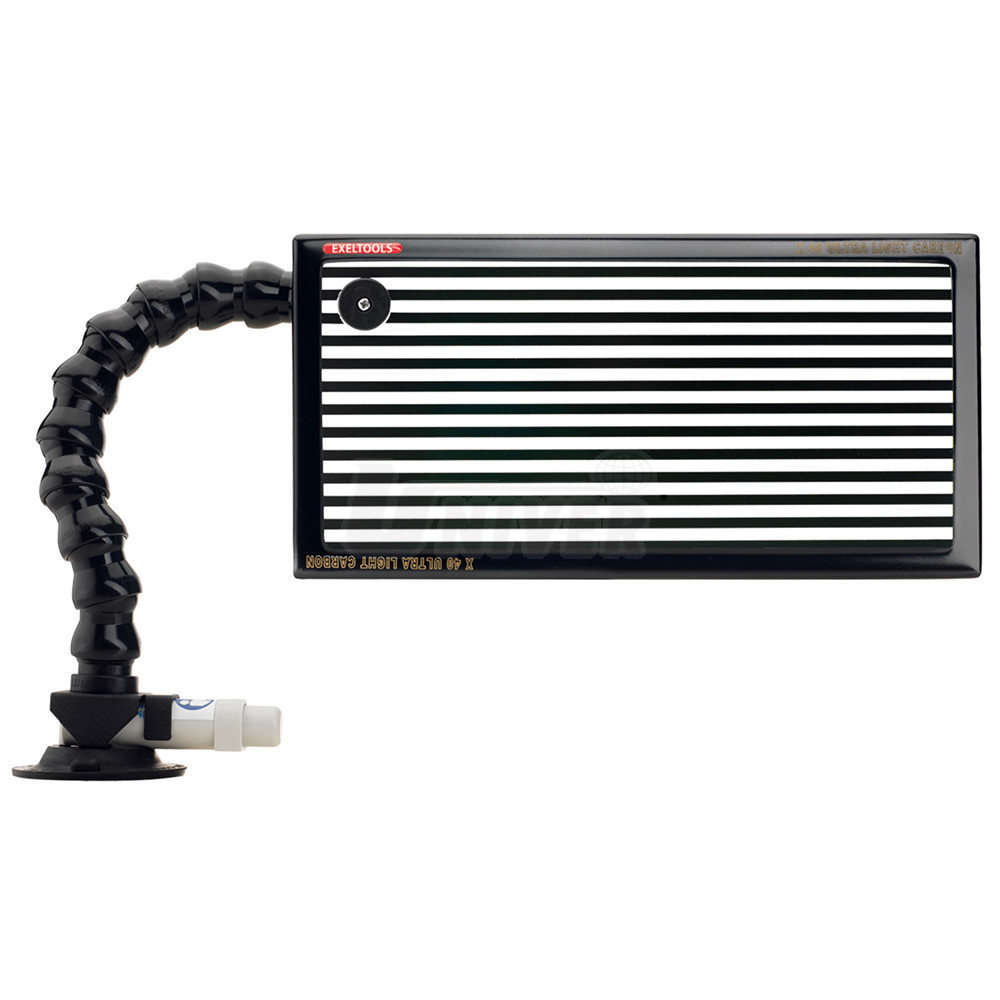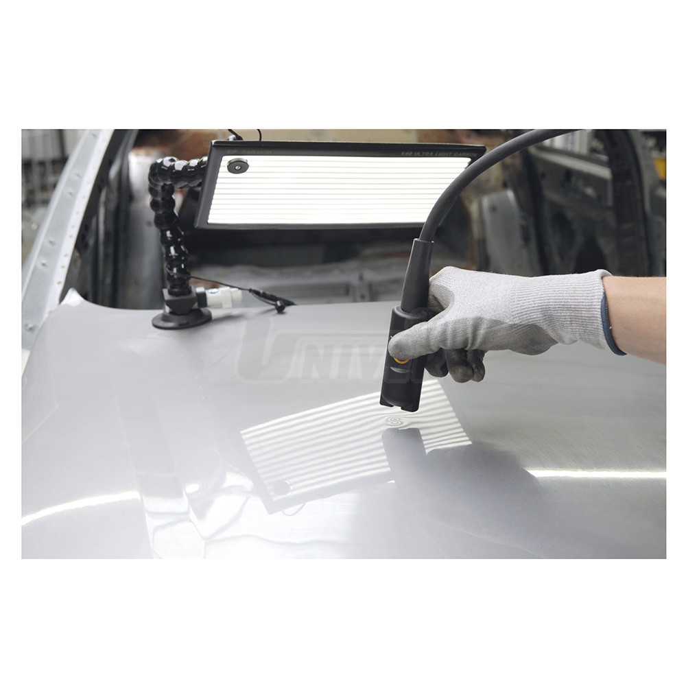 053175 - ultralehká karbonová lampa se používá jako velmi praktická pomůcka při vyrovnávání důlků v karosériích, na základě reflexí (kresby) této lampy na vrchní straně plechu lze přesně zjistit, kde jsou malé prohlubně v plechu, kde je třeba nasadit příslušný nástroj nebo nalepit adaptér pro vyrovnání důlku bez poškození laku a jak pokračuje postupné vyrovnávání důlků, lampa je opatřena přísavkou a nastavitelným stojánkem, na jeho horní části je uchyceno osvětlovací těleso s napájením 12 V.