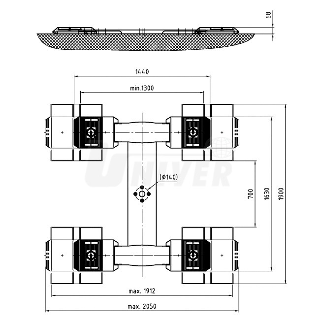 Nosnost 3,5 t, výška zdvihu cca 1862 mm, přejezdná výška cca 68 mm, rozsah nosných ramen 1300 – 1912 mm (podélně), 700 – 1900 mm (příčně).