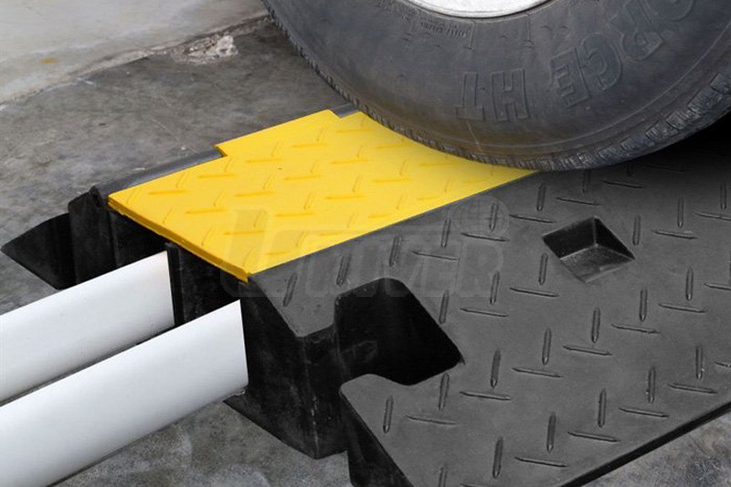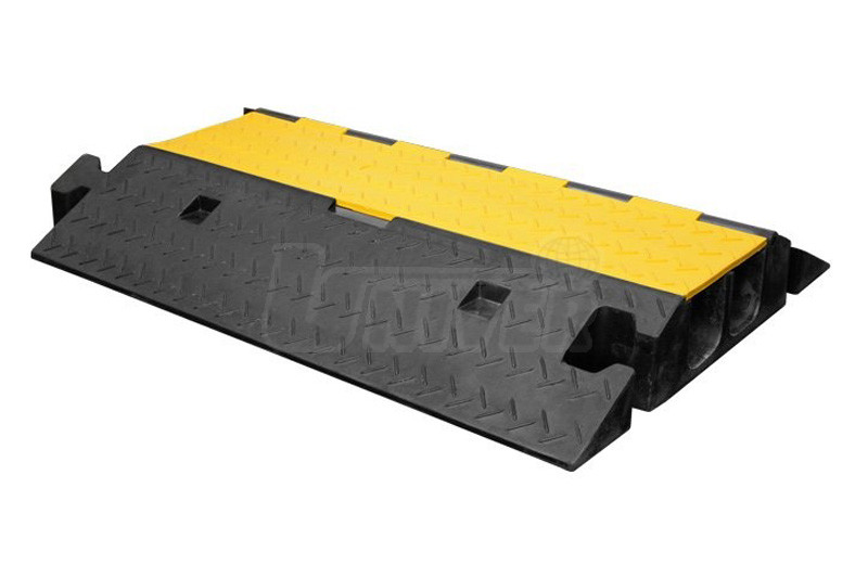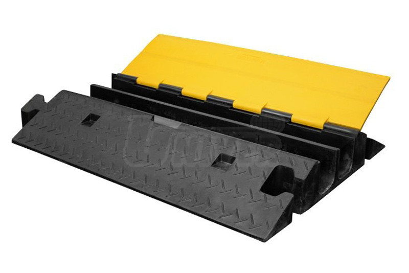 Zesílený pryžový přejezd se 2 kanálky a víkem slouží k ochraně kabelů, hadic, trubek atd., které jsou položené přes vozovku, komunikace pro chodce, chodníky, vnitřní komunikace v objektech apod.- kabelový přejezd pro ochranu na zpevněném povrchu položených kabelů, hadic, trubek atd.