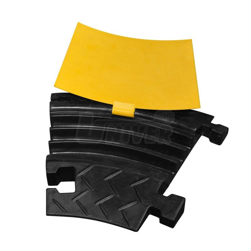 Pryžový kabelový přejezd / segment oblouku 30° se 3 kanálky a víkem slouží k ochraně kabelů, hadic, trubek atd., které jsou položené přes vozovku, chodníky, vnitřní komunikace v objektech apod.- kabelový most pro ochranu kabelů, hadic, trubek atd. položených na zpevněném povrchu