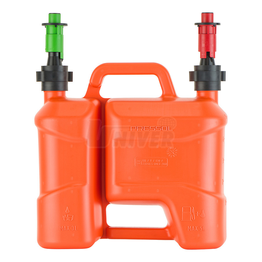 Kombinovaný kanystr s objemem 5 l pro palivo / 3 l pro olej s barevně odlišenými výtokovými nástavci s automatickou funkcí zabraňující přeplňování.- vynikající kombinovaný kanystr pro doplňování paliva a olejů