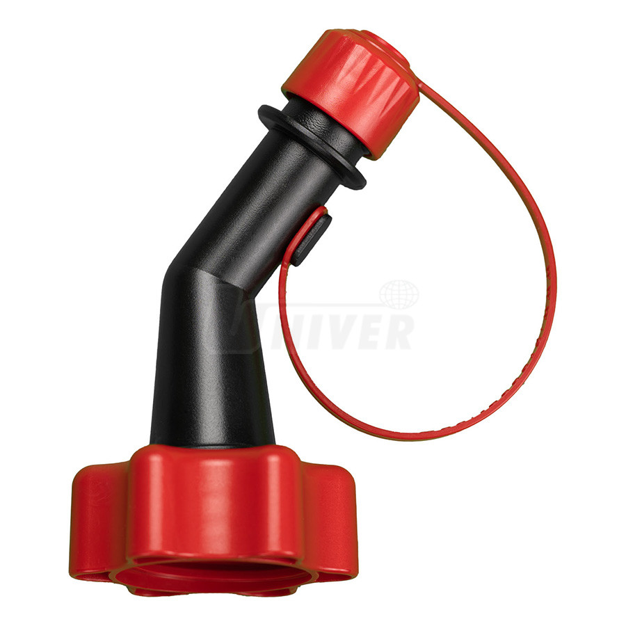 21 083 – standardní výtokový nástavec pro palivo, průměr na výtokovém konci 22,4 mm, délka 127,5 mm, materiál: POM, materiál těsnění FKM, barva černá + červená