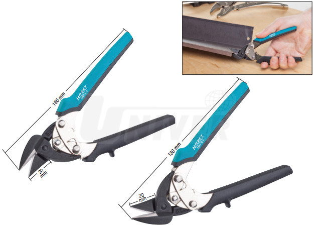 Karosářské nůžky na plech v menším kompaktním provedení, střihové části induktivně tvrzené a hlava nůžek je zápustkově kovaná. Jsou určeny pro průběžné přímé a tvarové stříhání plechu až do tloušťky 1,2 mm. Perfektní přepákování při malé konstrukci zajišťuje optimální střih s malou námahou. Rukojeti mají ergonomické plastové krytí. Délka obou kleští činí 180 mm.
