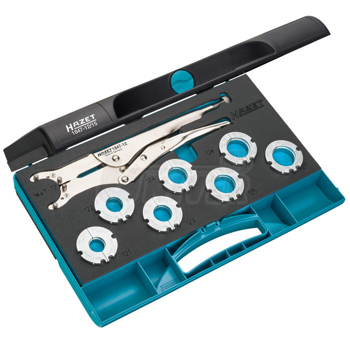 Sada obsahuje upínací / skřipcové kleště a 7 dělených přítlačných misek různých průměrů pro snadnou montáž kloubů na hnací hřídele.- sada upínacích / skřipcových kleští a dělených misek různých průměrů v praktickém plastovém kufříku