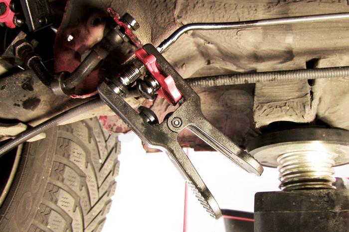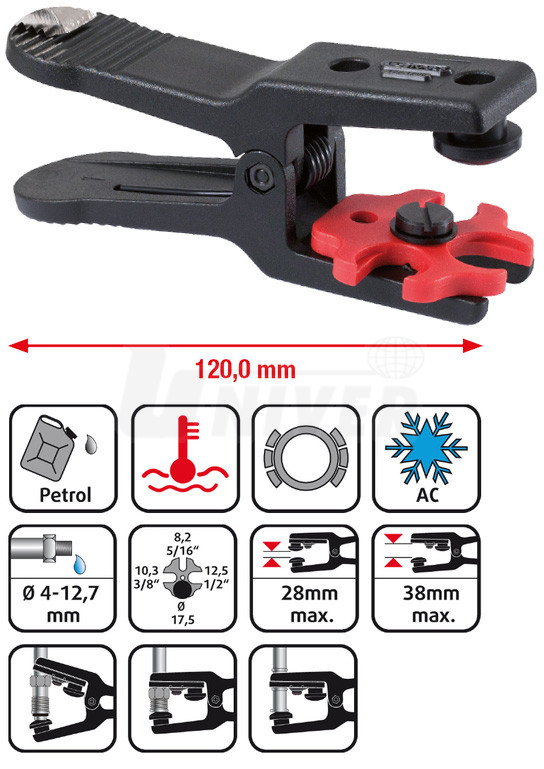 Pár kleštin z odolného plastu pro snadné uzavření vedení paliva a provozních kapalin o průměru 4,75 až 14 mm.- otočný zásobník se 4 upínači pro příslušný průměr vedení