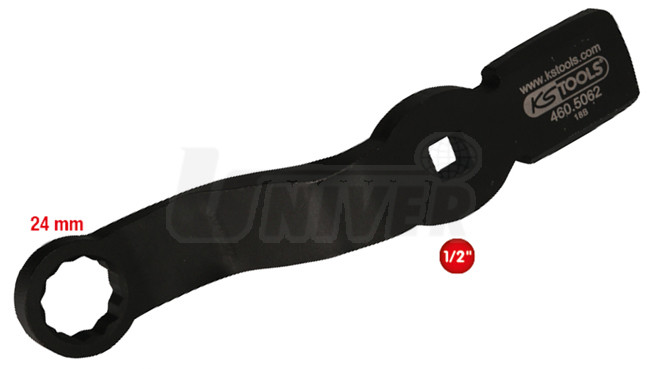Úderový / rázový klíč na šrouby brzdových válců nákladních automobilů a autobusů s dvanáctihranem 24 mm a vnitřním čtyřhranem 1/2".- úderový / rázový klíč s dvanáctihranem 24 mm a vnitřním čtyřhranem 1/2" pro snadné povolování a utahování šroubů brzdových válců nákladních automobilů a autobusů
