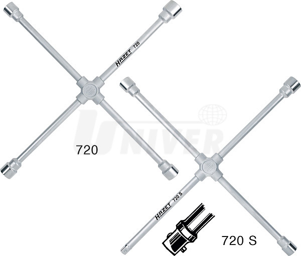Křížové klíče na matice/šrouby kol jsou vyrobeny z chrom-vanadia, pochromované, s leštěnými hlavicemi a s kovaným středovým křížem. Typ 720 S má na jednom rameni čtyřhran 3/4" pro hlavice (např. série HAZET 1000). Používají se u nákladních automobilů, autobusů, traktorů, stavebních a zemědělských strojů. Jsou extrémně zatížitelné a zkoušené až na 2000 Nm. Splňují normu DIN 3119.HAZET 720S - 24x27x32x3/4"