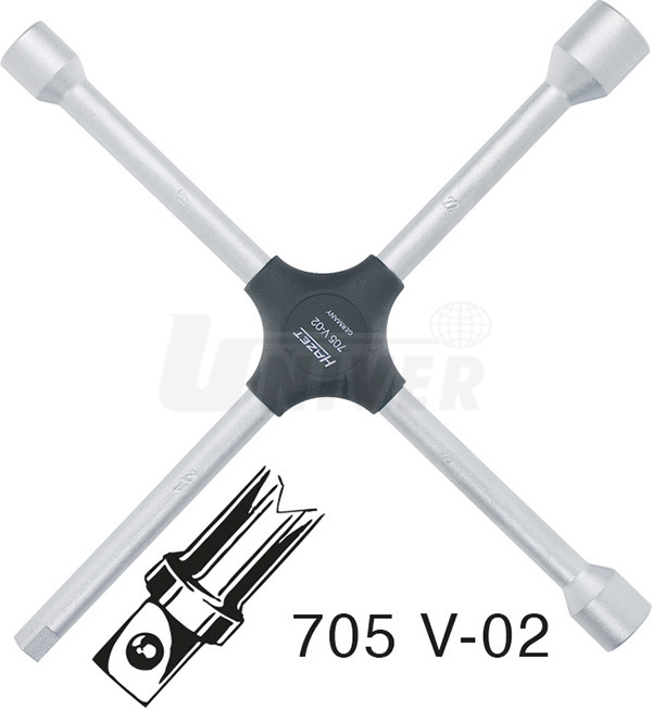 Křížový klíč na matice/šrouby kol (17 x 19 x 22 x 1/2") je vyroben ze speciální oceli a je pochromovaný . Má na jednom rameni čtyřhran 1/2" pro hlavice (např. série HAZET 900). Používá se u osobních automobilů a trasportérů. Splňuje normy DIN 3119, ISO 6788.