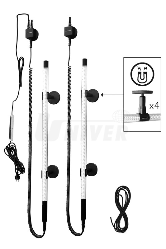 Sestava 2 lamp pro osvětlení dvousloupových zvedáků.- lampa standardně uchycená pomocí magnetů na sloupu dvousloupového zvedáku se na spodní část zvednutého vozidla umístí pomocí magnetů a nasměruje se na opravované místo