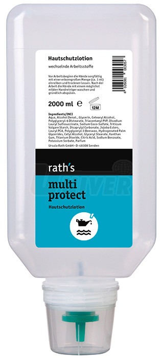 Rath´s multi protect se nanáší v množství 0,5-1 ml (cca čtvrtina až polovina velikosti lískového ořechu) na zadní stranu jedné, čisté a suché ruky. Pak se zadními stranami obou rukou rovnoměrně rozetře. Následně se gel pečlivě vetře do citlivých oblastí ruky (mezi prsty, záhyby prstů, oblast nehtů). Zbývající gel se potom pohyby jako při mytí vmasíruje do pokožky, až je zcela vetřený. Nechá zcela uschnout. Podle zatížení nečistotou a druhu činnosti se může nanesení ochranného mléka Rath´s multi protect opakovat i několikrát za den.