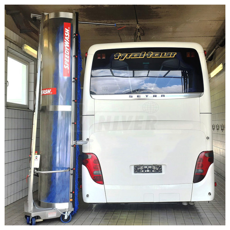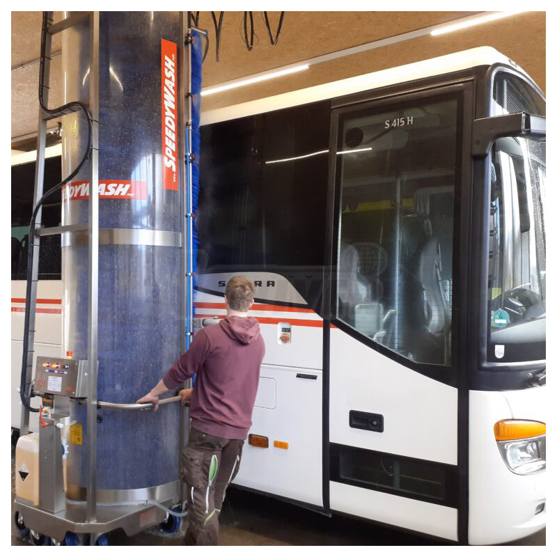 Mobilní kartáčové mycí zařízení pro mytí autobusů, nákladních automobilů a obdobných užitkových automobilů vhodné pro omezené prostory.- mobilní kartáčové mycí zařízení na bázi nejmodernější techniky pro kvalitní a snadné mytí autobusů, nákladních automobilů a obdobných užitkových automobilů bez nutnosti stacionární kartáčové umývárny