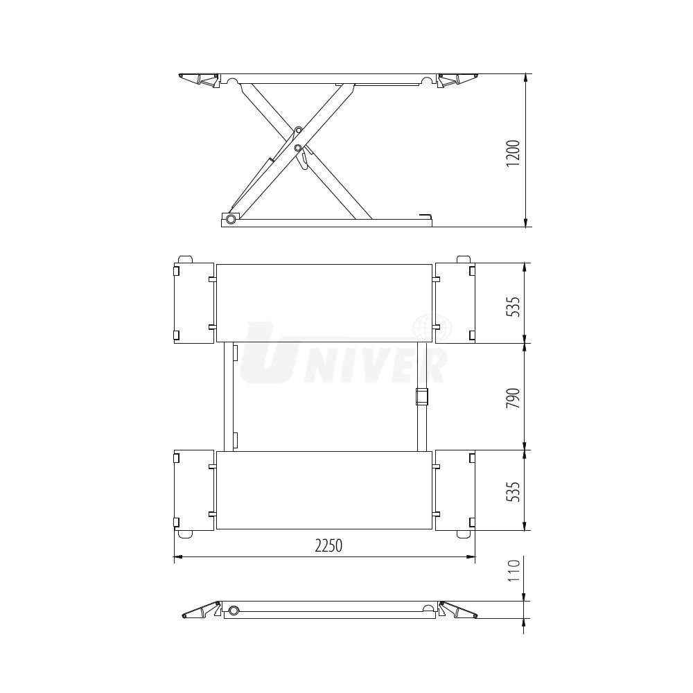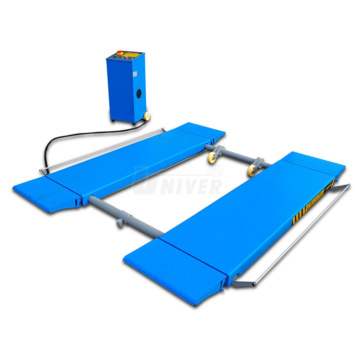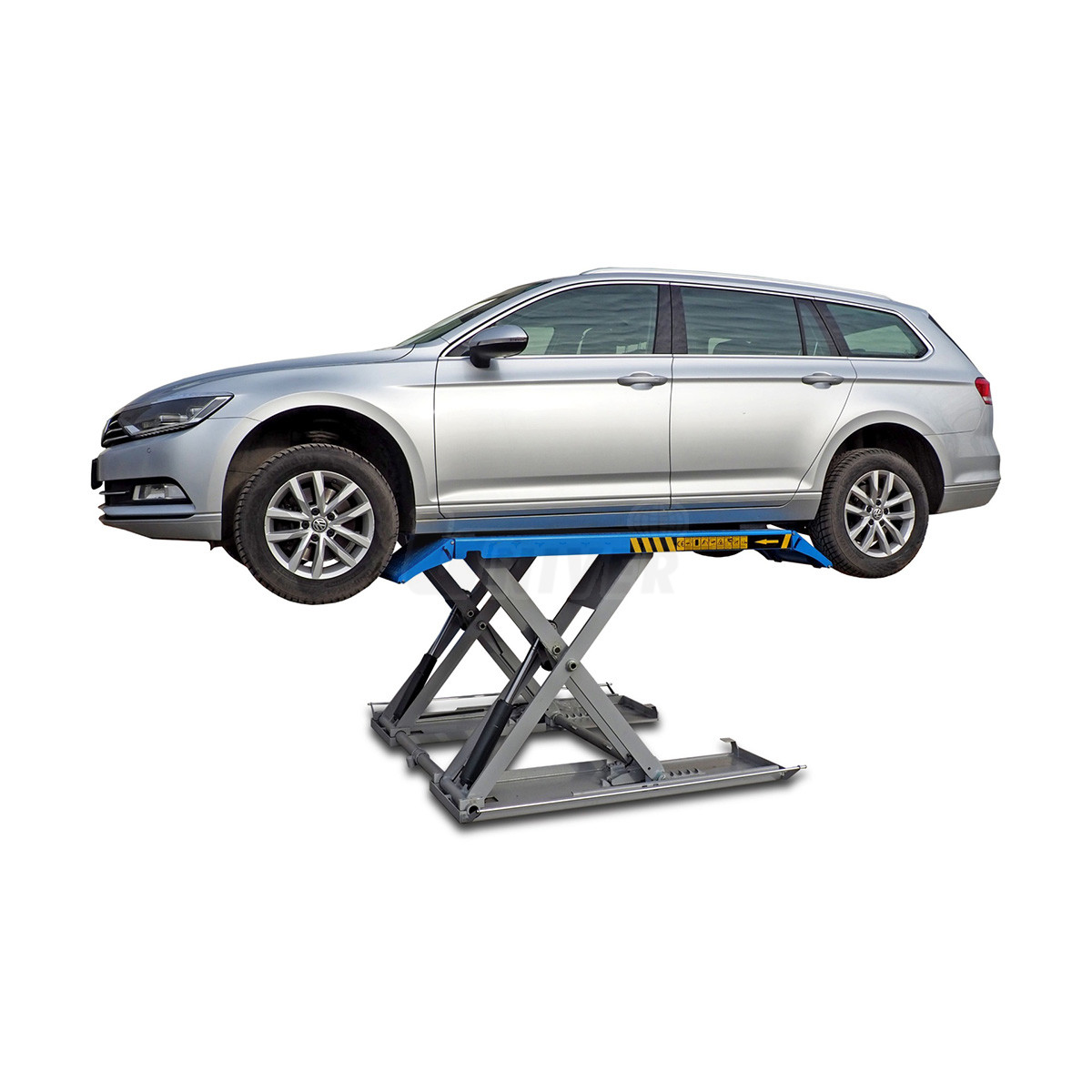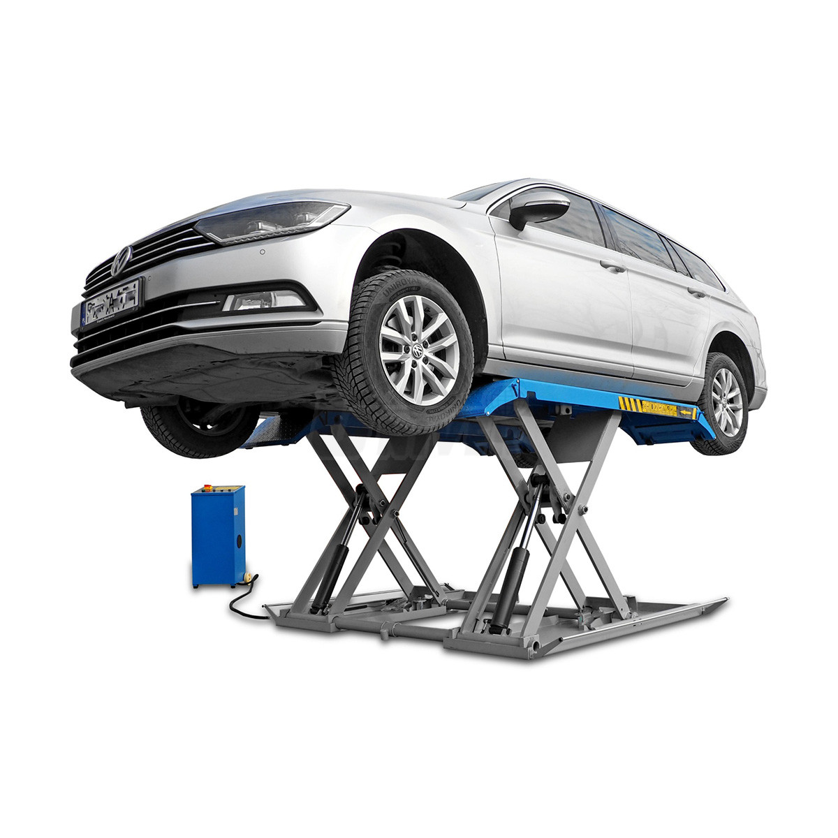 zvedák má dva spodní rámy, které jsou na podlaze, nůžkovou zvedací konstrukci se dvěma hydraulickými jednotkami, dvě nosné plošiny a oddělenou pojízdnou ovládací jednotku / skříň s ovládacím panelem, obě plošiny mají na obou koncích nájezdové plošinky