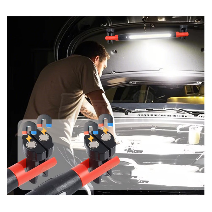 Dílenská montážní lampa trubicového provedení s postranními magnetickými otočnými držáky a uchycovacími háčky.- praktická dílenská montážní lampa trubicového provedení o délce 520 mm