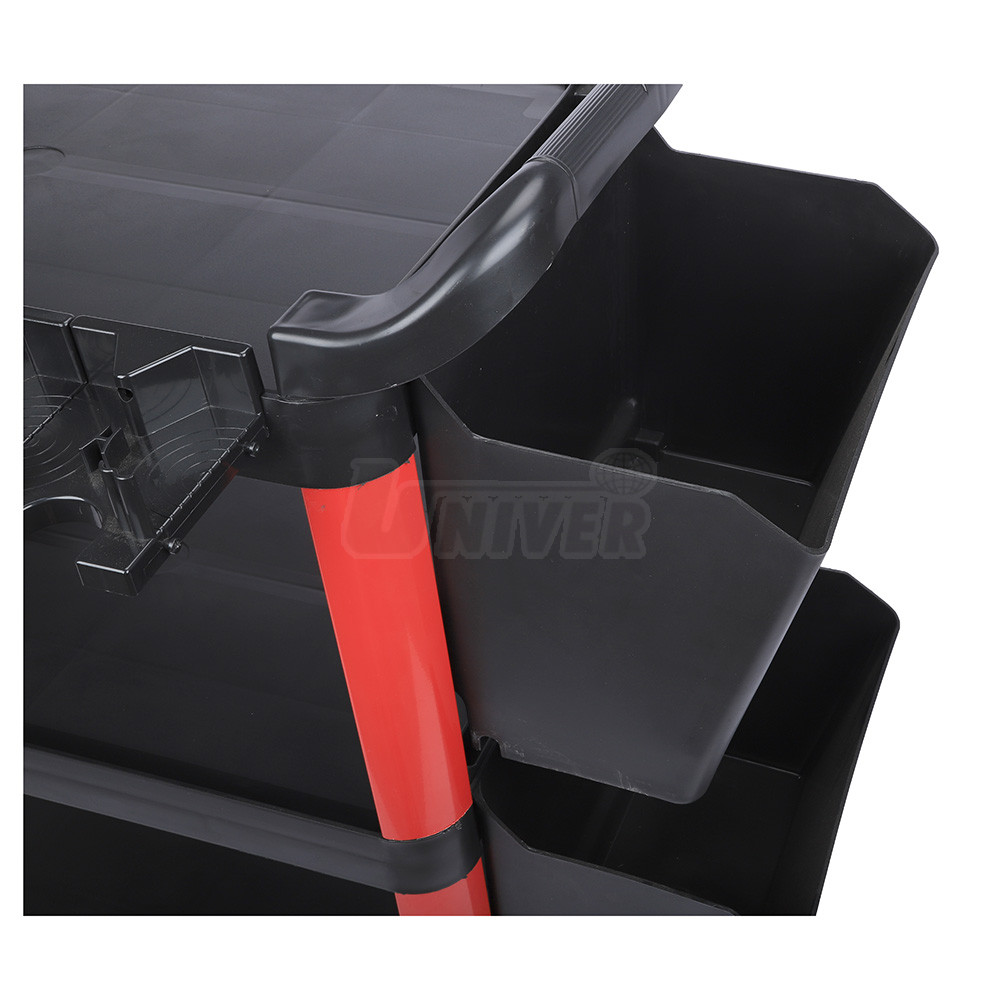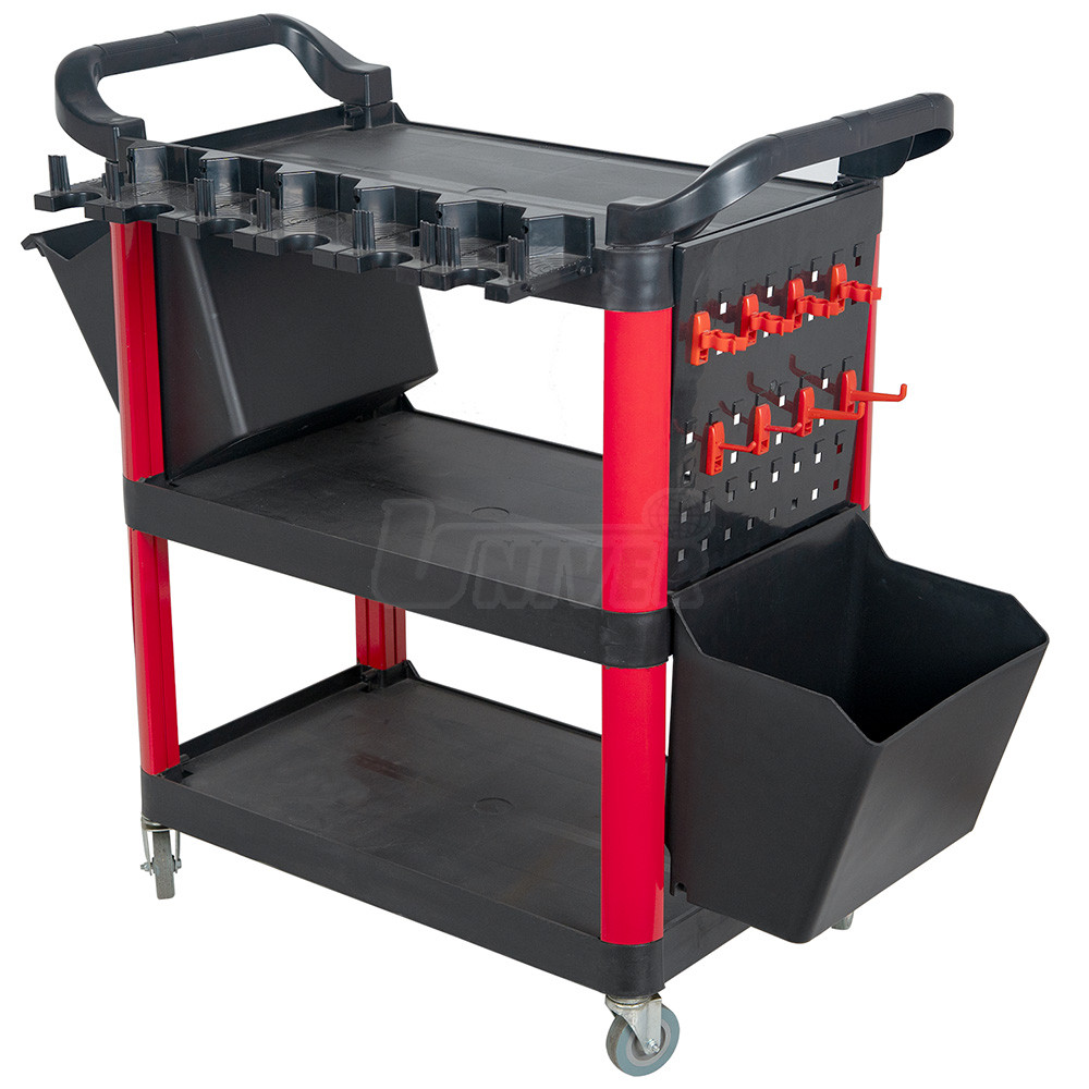 Montážní dílenský vozík vybavený účelným příslušenstvím.- tříúrovňové provedení (spodní, středová a horní úložná deska)