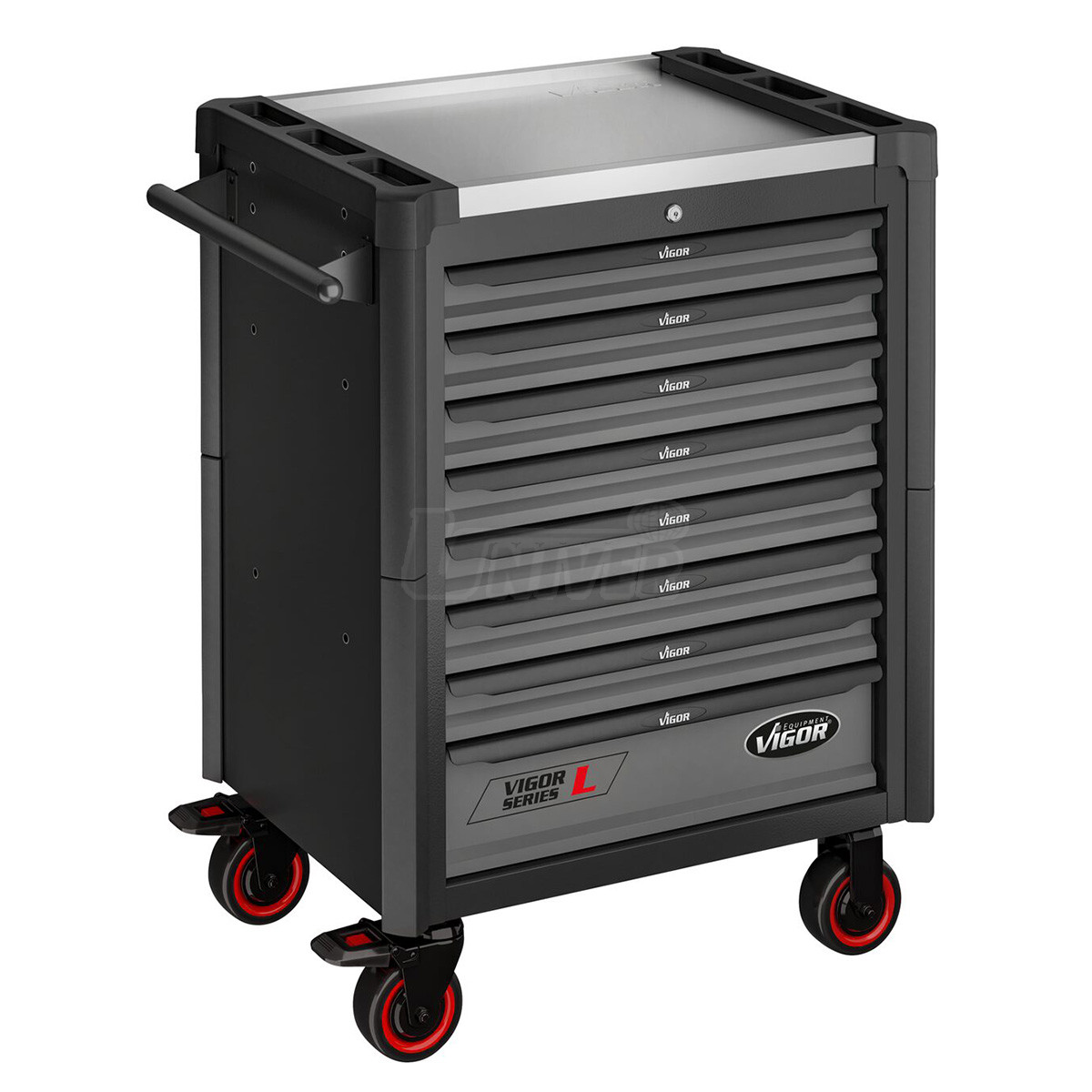 Montážní vozík s nerezovou pracovní deskou se 344-dílnou sadou ručního nářadí rozdělenou do 5 velkých modulů má 8 zásuvek (1 vysoká a 7 nízkých).- 5 modulů (VIGOR V4188 / V6643N / V4230 / V5637N / V2837) s ručním nářadím (344 ks):