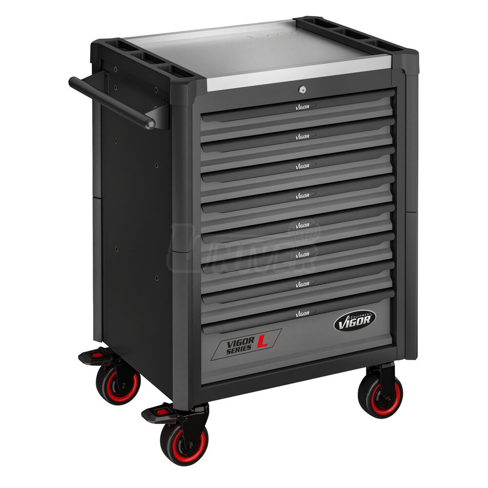 Montážní vozík s nerezovou pracovní deskou se 442-dílnou sadou ručního nářadí rozdělenou do 4 velkých a 9 menších modulů má 8 zásuvek (1 vysoká a 7 nízkých).- 13 modulů (VIGOR V4188 / V4753 / V6724N / V5006 / V5017 / V4995 / V5068 / V4991 / V5070 / V5004 / V5072 / V5633N / V6811) s ručním nářadím (442 ks):