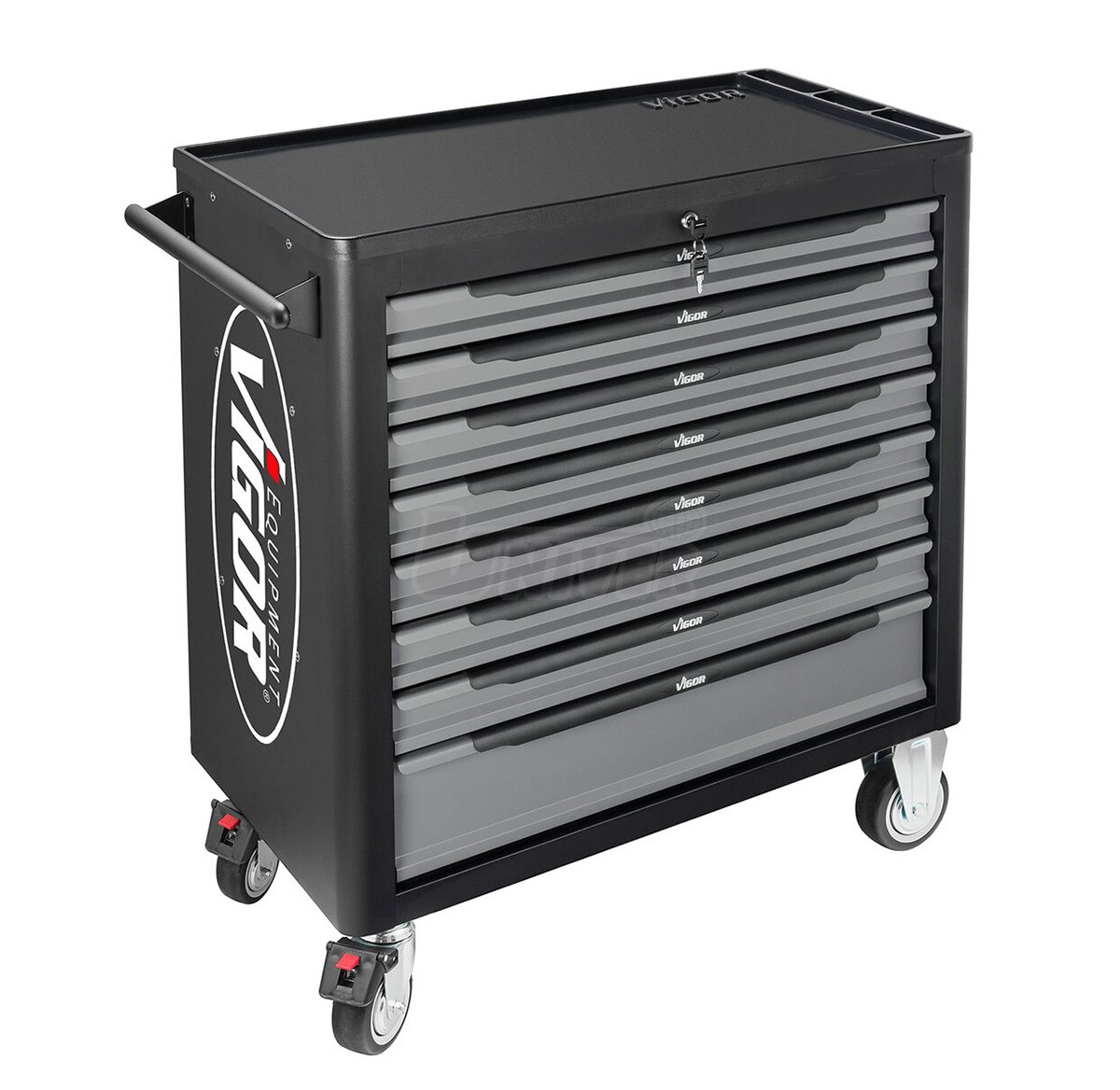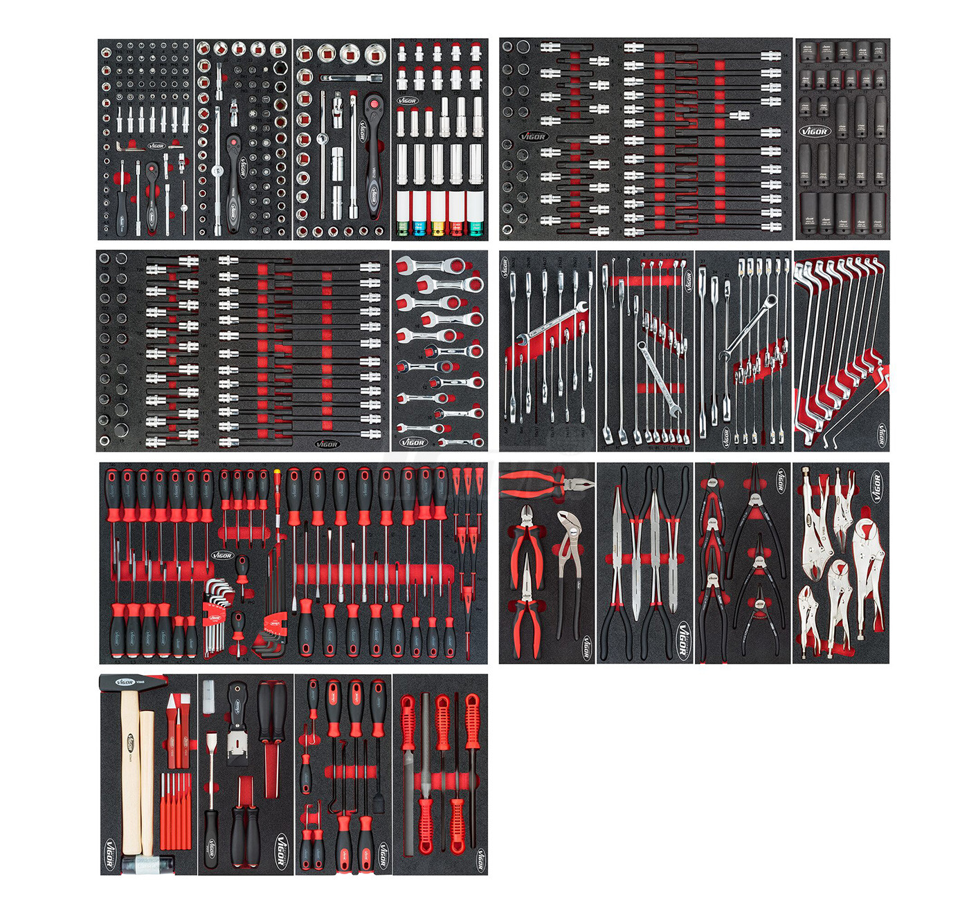 Montážní vozík s 499-dílnou sadou ručního nářadí rozdělenou do 21 modulů má 8 zásuvek (1 vysokou a 7 nízkých) a pracovní desku z odolného plastu.- 21 modulů (VIGOR V4971 / V4973 / V4975 / V7323 / V4727 / V5602 / V5006 / V5017 / V5070 / V5072 / V4979 / V4985 / V4987 / V4981 / V5170 / V4729 / V5075 / V5633 / V4995 / V4999 / V5004) s ručním nářadím (499 ks), jde o sady ráčen, nástrčných klíčů a bitů 1/4", 3/8" a 1/2" / 4 až 32 mm, otevřených, očkoplochých a vyhnutých očkových klíčů (6 až 36 mm), šroubováků, kleští, sekáčů, vyrážečů, ale také o kladivo, ocelovou palici atd.