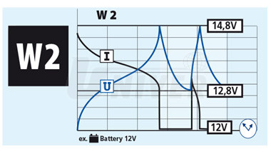 - 3 regulační/nabíjecí stupně: normální nabíjení (CHARGE 12 V/8 A, 24 V/7 A), nabíjení vyšším proudem (BOOST 1 12 V/17 A, 24 V/14 A) a nabíjení ještě vyšším proudem (BOOST 2 12 V/25 A, 24 V/22 A)