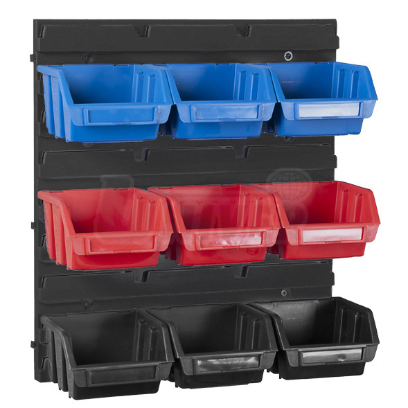 Sada nástěnné desky a 9 plastových závěsných boxů Ergobox 1.- výborné uplatnění jak pro dílny, tak pro hobby-sektor