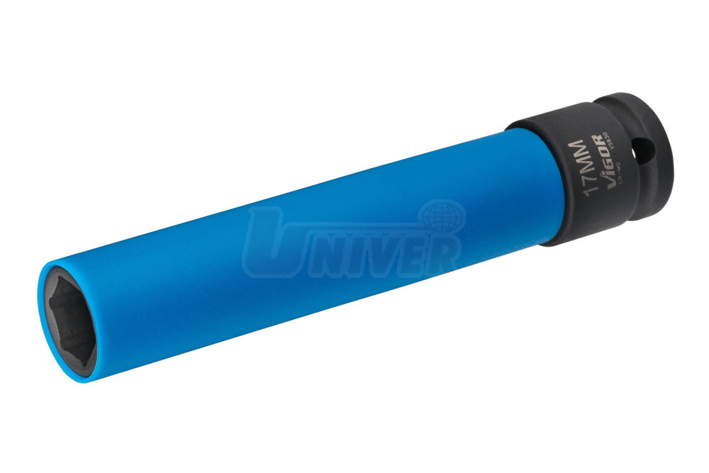 Extra dlouhá nástrčná hlavice na kolové šrouby (17 mm).- zajišťuje práci s kolovými šrouby bez jejich poškození díky spolu se otáčející plastové ochraně