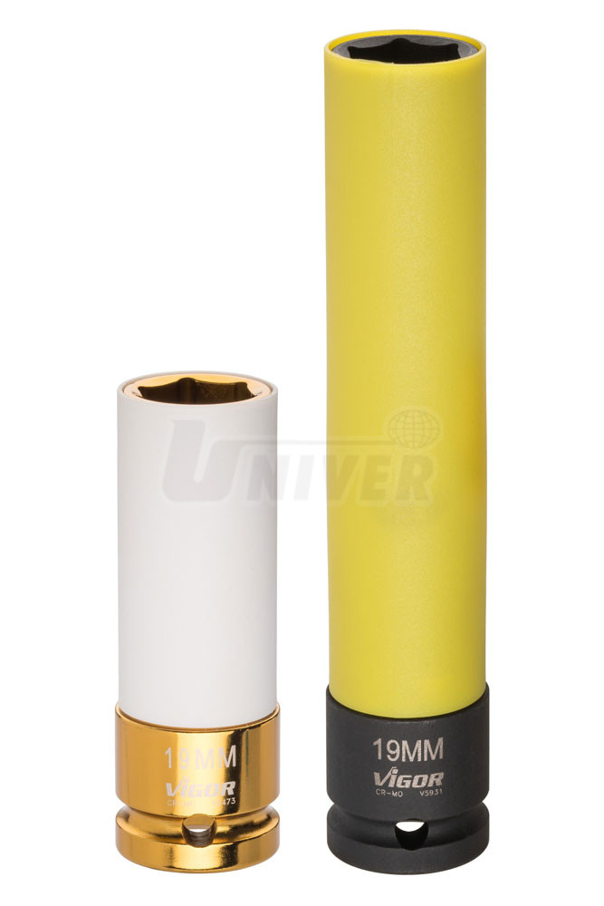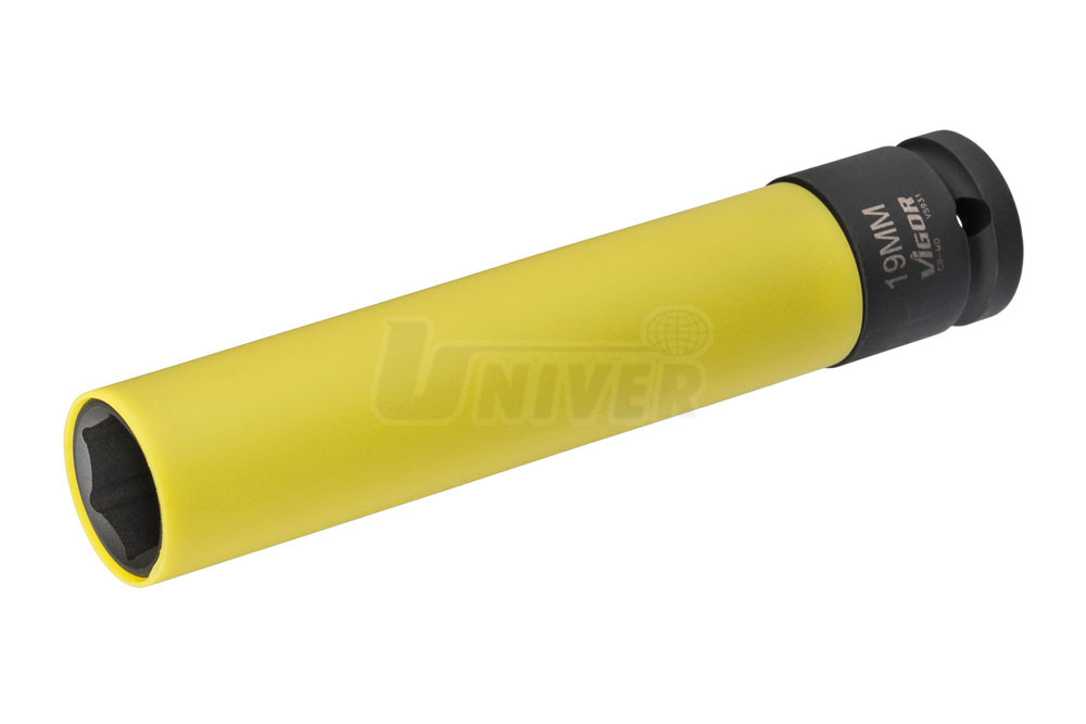 Extra dlouhá nástrčná hlavice na kolové šrouby (19 mm).- zajišťuje práci s kolovými šrouby bez jejich poškození díky spolu se otáčející plastové ochraně