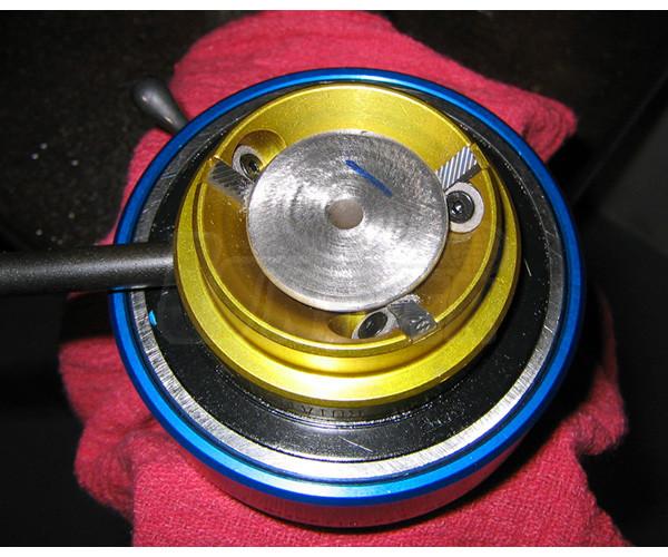 Delší pákou se pomalu otáčí v naznačeném směru (cca jedna otáčka za 2 sekundy). Zároveň s otáčením nástroje pákou se také ihned natáčí malou páčkou proti směru hodinových ručiček tak daleko, až je cítit odpor. V této poloze páčku ponecháme (pustíme). Tím je docílen správný, automatický přítlak kuželové plochy ventilu vůči wolframkarbidovým nožům. Poté stačí několik málo otáček a první očištění/orovnání kontaktní plochy ventilu je realizováno. Pak stačí malou páčkou opět o kousek postoupit (dále proti směru hodinových ručiček) a stále otáčet delší pákou. Po několika otáčkách lze malou páčku vrátit do výchozí pozice, uvolnit tlak svěráku na obě V-čelisti a ventil vyjmout z přípravku. Ten se, stejně jako ventil, následně ihned očistí. Zejména pak nože nástroje. Kdyby náhodou nebyla kuželová těsnicí plocha ventilu v dokonalém stavu, je samozřejmě možné popsané operace zopakovat.