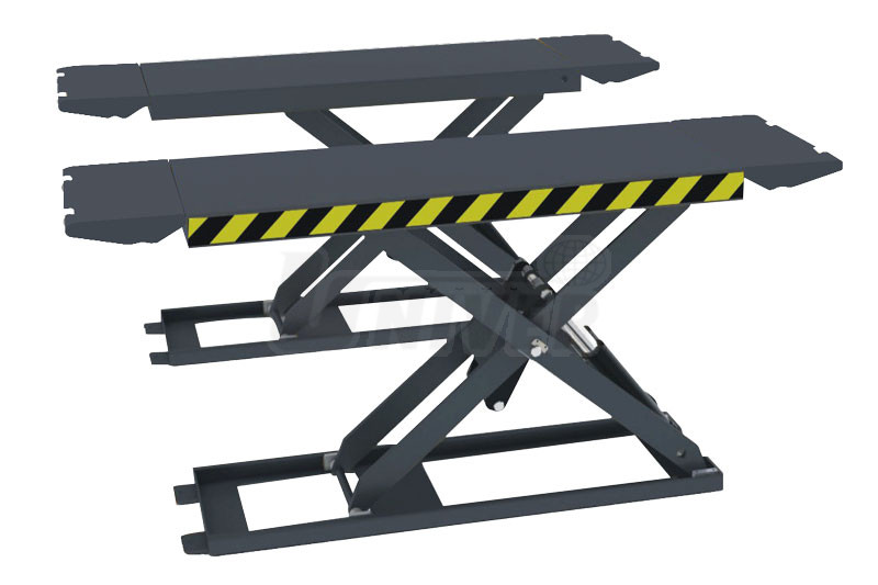 Nůžkový elektrohydraulický nízkozdvižný / stacionární zvedák s nosností 3 000 kg s délkově nastavitelnými plošinami a velmi nízkou konstrukcí pro instalaci na podlahu.