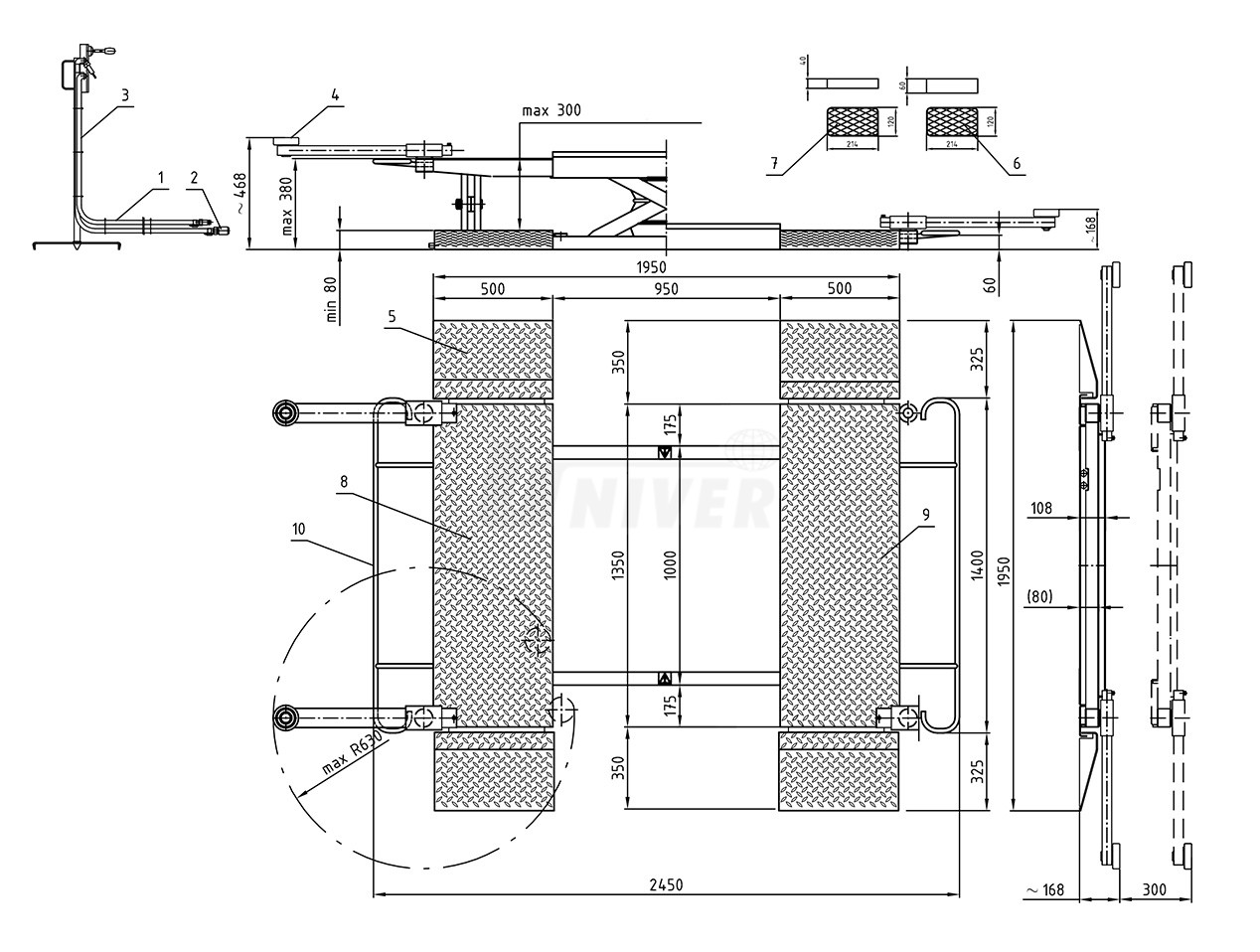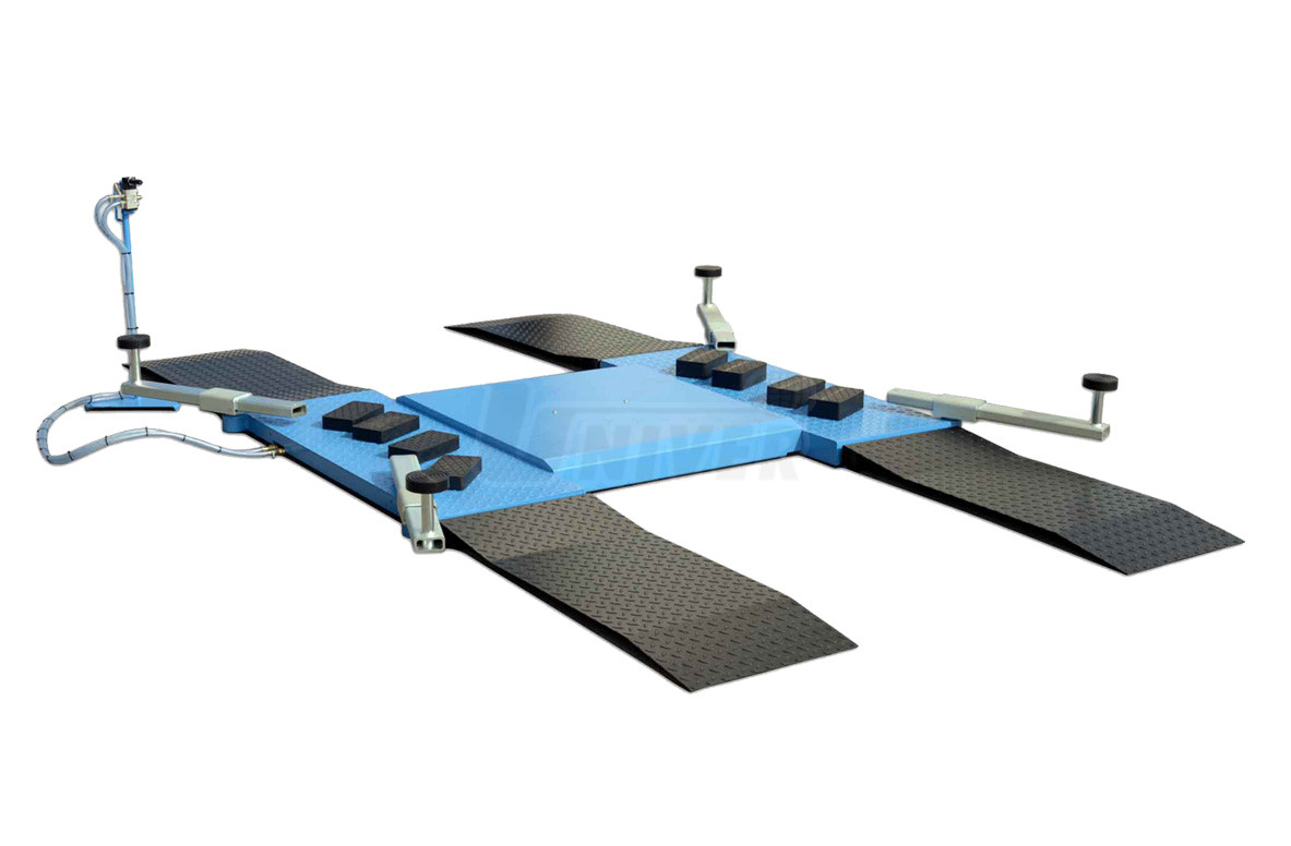 dodává se včetně krátkých nájezdových ramp a 4 menších a 4 větších gumových podložek, ale bez otočných nosných ramen a delších nájezdových ramp, ramena a delší rampy jsou volitelným příslušenstvím