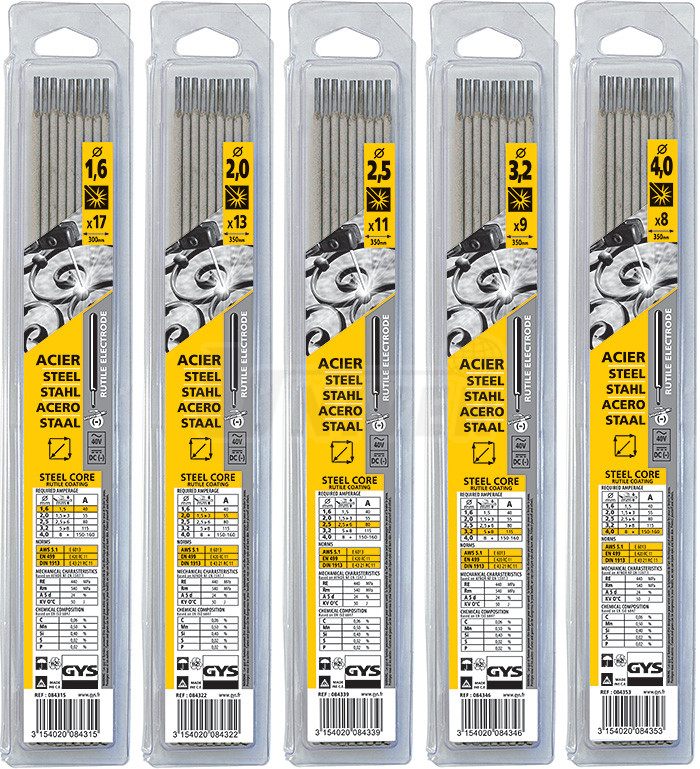 Vysoce kvalitní obalované svářecí rutilové elektrody se používají pro běžné svařování ocelí, obzvláště tenkých plechů a to ve všech pozicích. Výborně se zapalují a jejich sváry jsou čisté s lehkým převýšením.Dodavatel: GYS / Francie