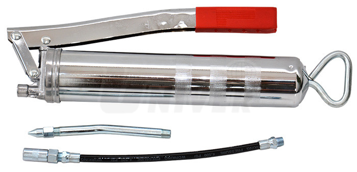 Ruční mazací lis s pákou opatřenou plastovým držadlem pro tlakové mazání běžnými plastickými mazivy lze při použití doplnit buď vysokotlakou hadicí s mazací koncovkou dl. 300 mm nebo zahnutým kovovým trubkovým nástavcem s mazací koncovkou dl. 190 mm. Mazací tlak činí 500 bar, objem maziva 500 cm3, hmotnost 1,2 kg.
