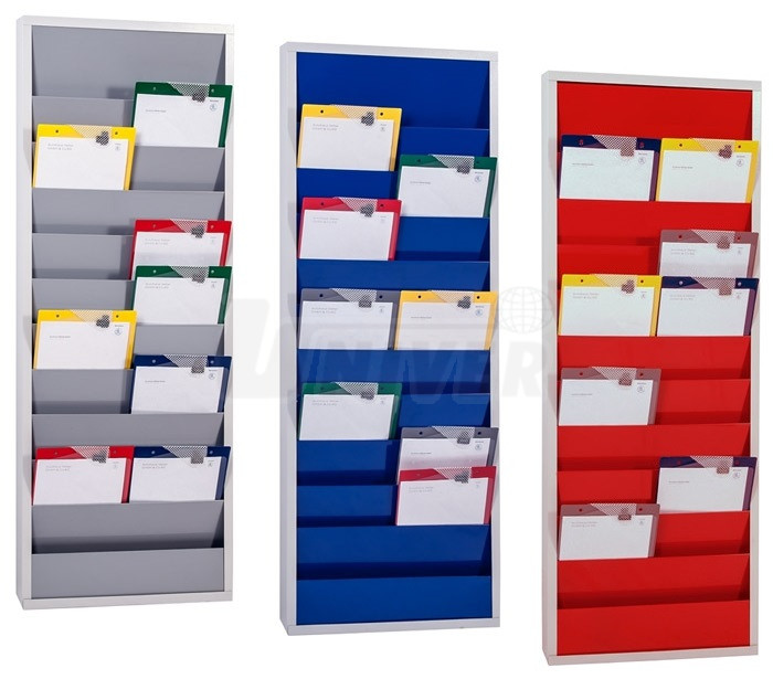 Plánovací tabule pro dokumenty formátu A4 s jednotnou šířkou 554 mm i výškou 1280 mm, s 10 přihrádkami, v červené, modré a šedé barvě.- 3 různě barevné kovové plánovací tabule dvouřadé pro dokumenty formátu A4 (desky na zakázky, zástrčné karty atd.)