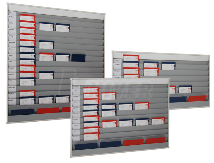 Plánovací tabule pro dokumenty formátu A4 s jednotnou šířkou 1580 mm, ve 3 výškách a s počtem přihrádek 6, 10 nebo 15.- 3 různě velké plánovací tabule ze speciální umělé hmoty pro dokumenty formátu A4 (desky na zakázky, zástrčné karty atd.)