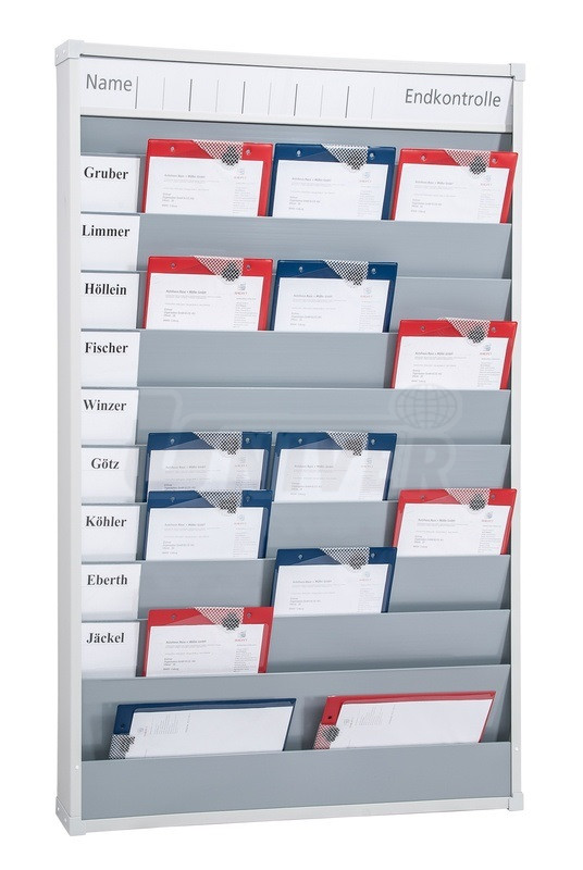 Plánovací tabule pro dokumenty formátu A4 s šířkou 870 mm, výškou 1282 mm a s 10 přihrádkami.- plánovací tabule ze speciální umělé hmoty pro dokumenty formátu A4 (desky na zakázky, zástrčné karty atd.)