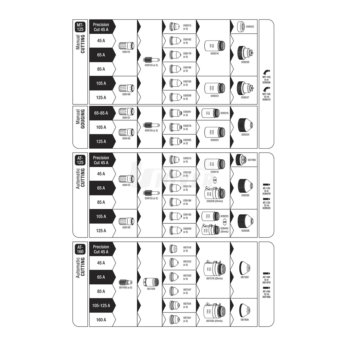 039544 - sada náhradních dílů k hořáku MT-125 v plastové krabičce, 105/125 A